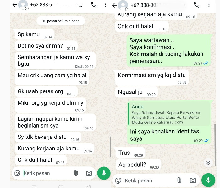 "Sp kamu, Dpt no sya dr mn?, Sembarangan ja kamu wa sy bgtu, Mau crik uang cara yg halal, Gk usah peras org, Mikir org yg kerja d dlm ny, Lagian ngapai kamu kirim beginian sm sya, Sy tdk bekerja d stu, Kurang kerjaan aja kamu, Crik duit halal," demikian tulis Kapten L saat menjawab pesan WhatsApp konfirmasi.