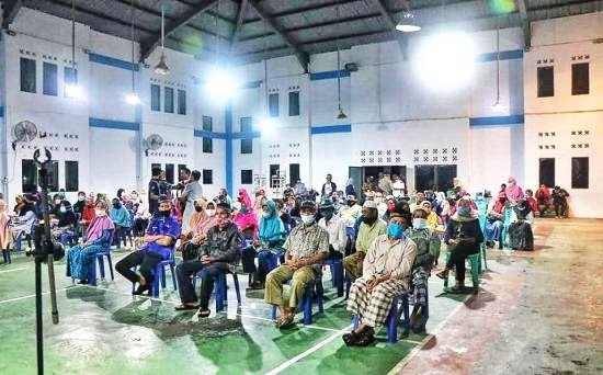 Bapak-bapak dan Ibu-ibu Desa Malang Rapat menunggu antrian sembako. |