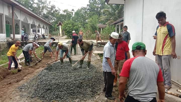 Kampar - Dalam menyambut ulang tahun desa Pulau Gadang, Kampar pada Milad desa tahun 2020, Pemerintahan desa, swadaya masyarakat dan pemuda melakukan gotong royong bersama membangun jalan semenisasi Surau "Suluok Darussholihin" di Dusun 1, desa Pulau Gadang, kecamatan XIII koto Kampar, Kampar, pada Selasa (3/11/20).