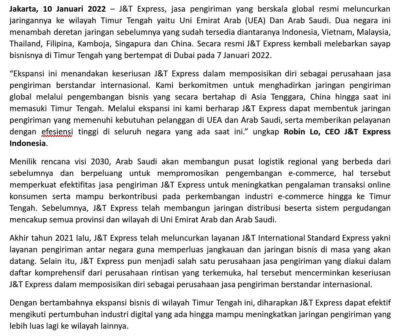 Sukses melebarkan sayapnya di Indonesia, Vietnam, Malaysia, Thailand, Filipina, Kamboja, Singapura dan China, secara resmi perusahaan jasa pengiriman yang berskala global, J&T Express, meluncurkan jaringan barunya ke wilayah Timur Tengah yaitu Uni Emirat Arab (UEA) Dan Arab Saudi.