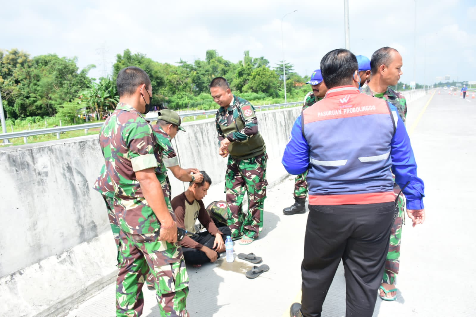 Kali ini juga terpantau warganet, kecelakaan naas terjadi di ruas tol KM 826 Pasuruan - Probolinggo pada hari Rabu, 23 Maret 2022 sekitar pukul 09.22 WIB juga terlihat anggota TNI ini melakukan pengobatan dilapangan.