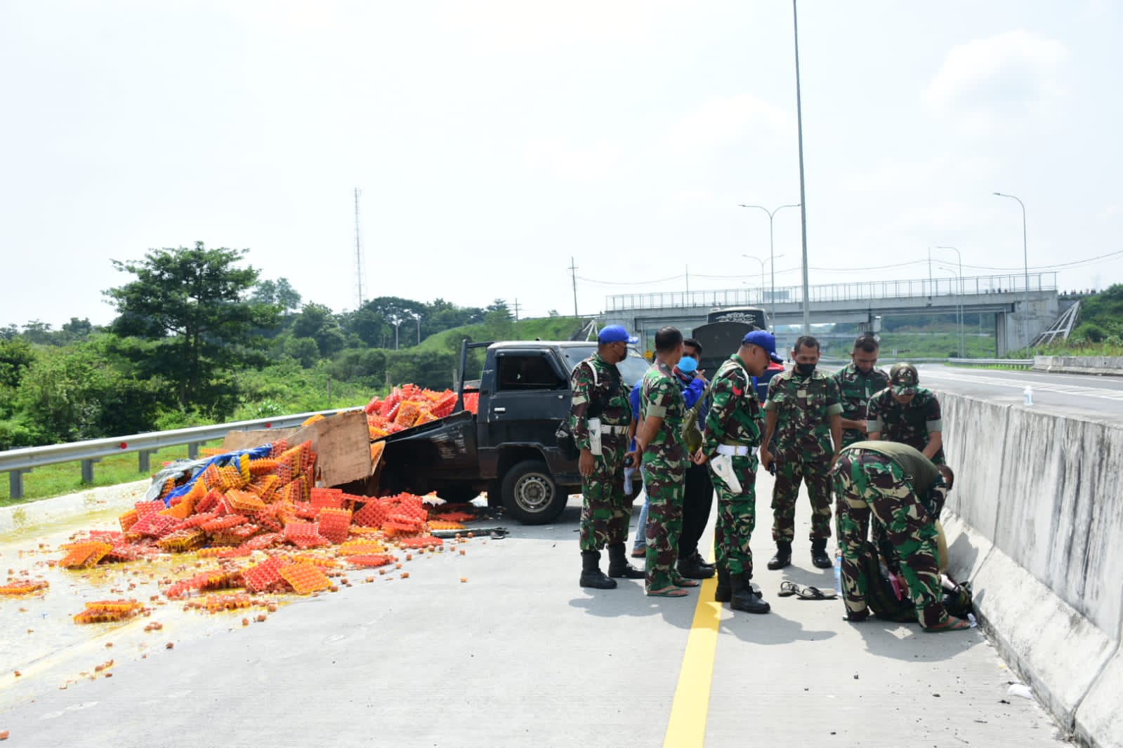 Dalam kejadian tersebut sebuah pick up yang mengangkut bahan pangan berupa telur ayam mengalami pecah ban sehingga menyebabkan mobil oleng dan menabrak pembatas mobil di jalan tol.