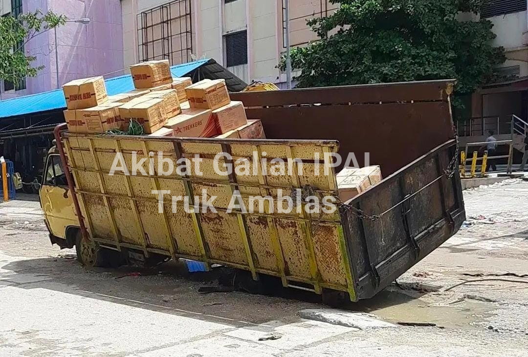 Akibat tak kunjung diaspalnya jalan ini salah sat truk Selasa (14/6/22) terpantau medsos terpuruk diatas bekas galian IPAL tersebut.**