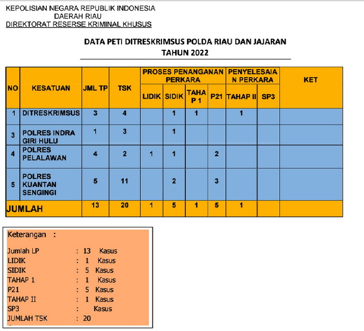 Dalam dokumen yang dikirimkan pihak Direktorat Reserse Kriminal Khusus (Ditreskrimsus) Polda Riau terlihat ada nol kasus SP3. dari pihak Ditreskrimsus sendiri sedang menangani kasus illegal mining mentersangkakan 4 orang dimana saat ini ada yang sudah masuk dalam tahap II.